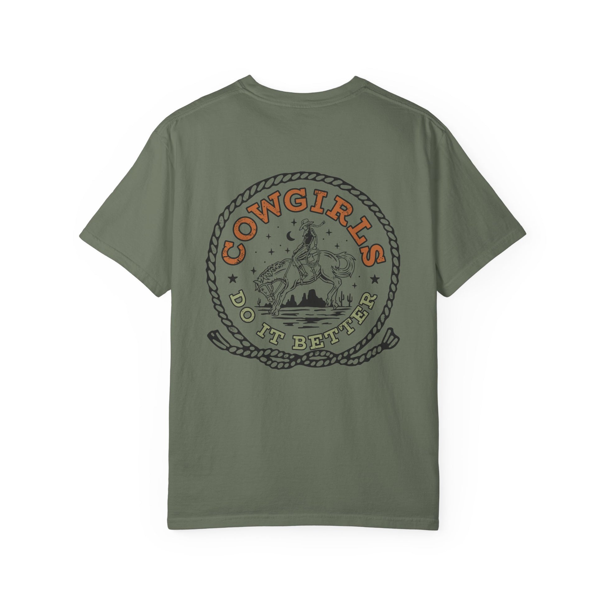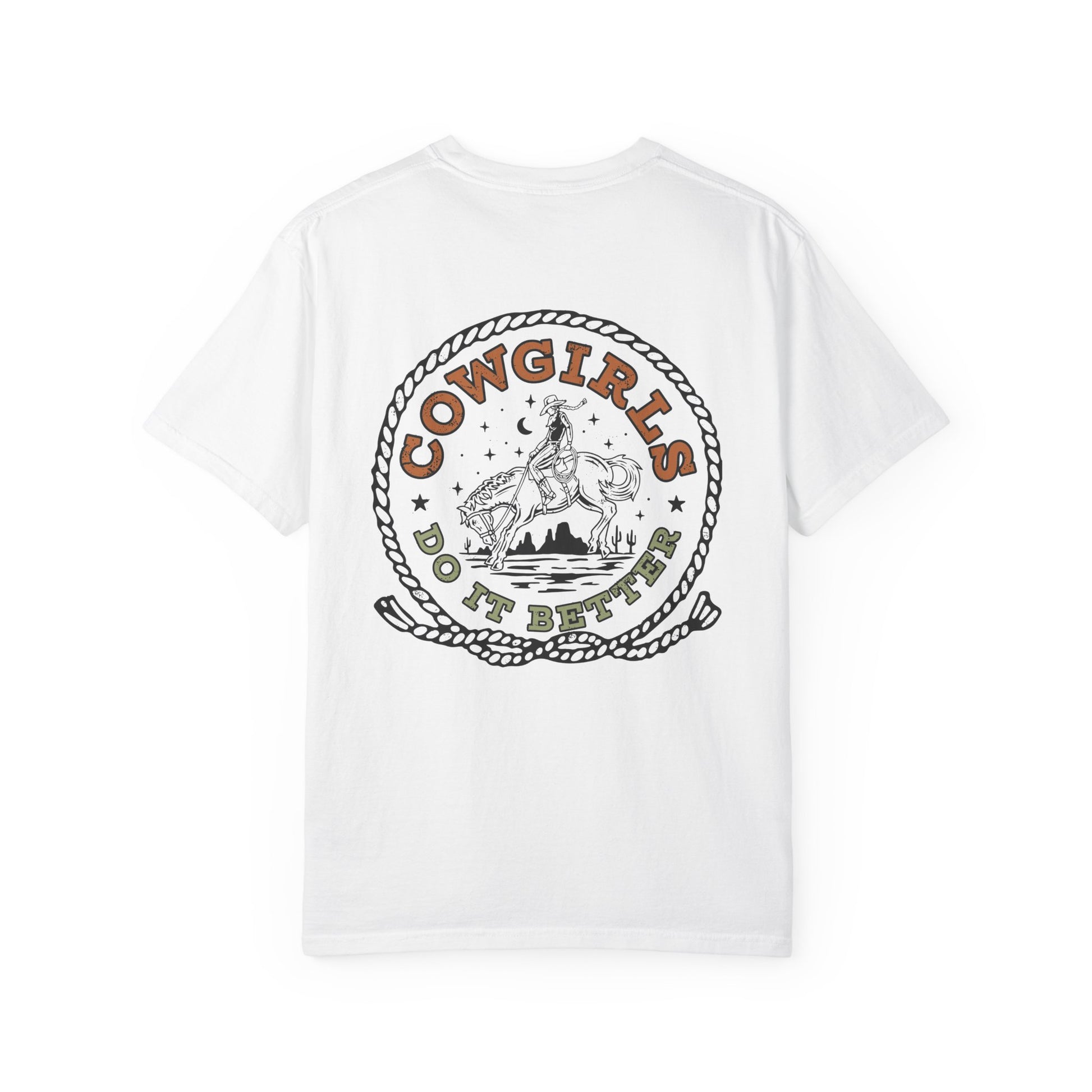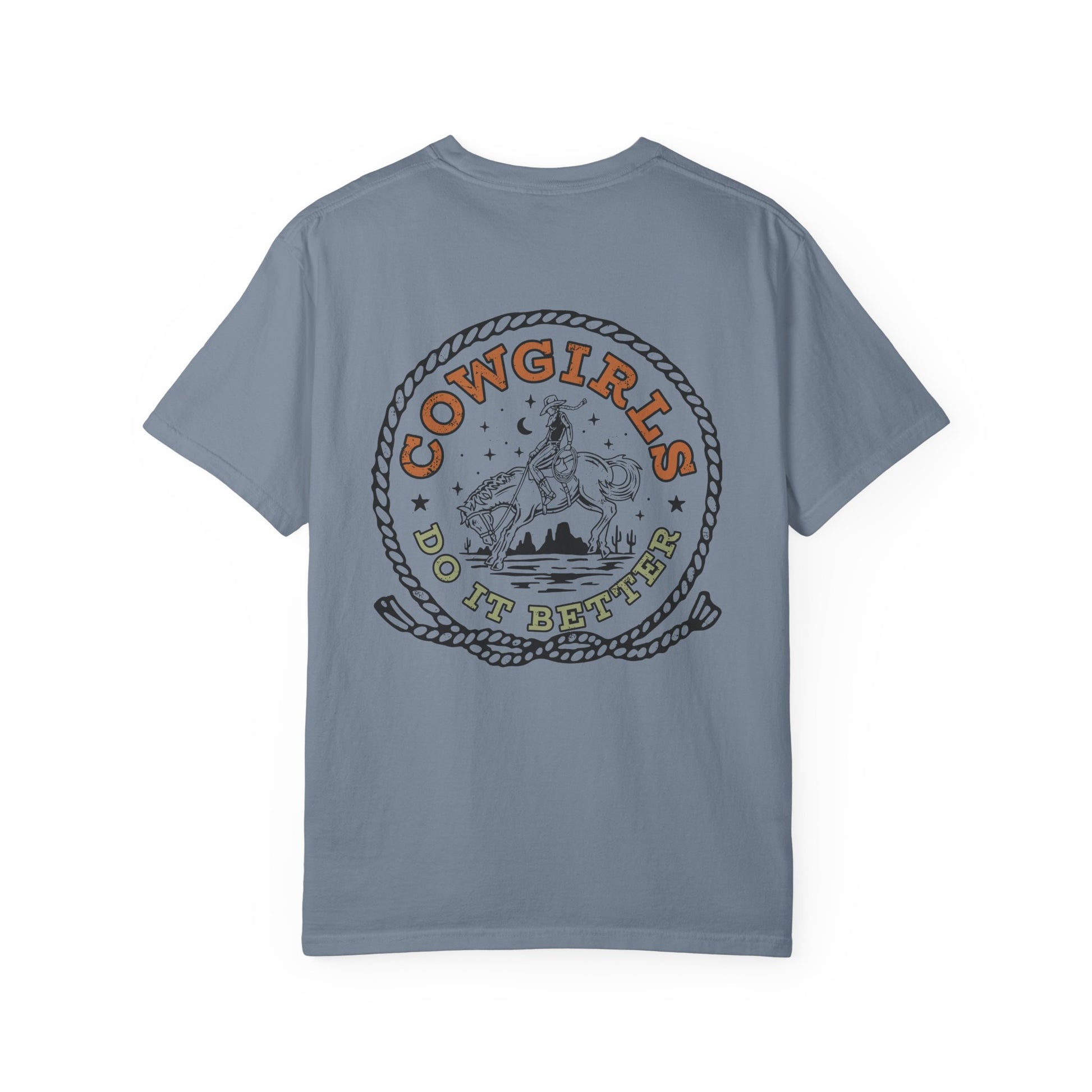 Soft, washed cotton with a lived-in feel and a bold, western heartbeat. This relaxed, garment-dyed tee lays easy over jeans or tucked into a high-waisted skirt, letting the vintage-style “Cowgirls Do It Better” artwork do the talking. The print’s rope frame, desert horizon and riding silhouette evoke late-afternoon trail rides and sun-warmed leather. Wear it to small rodeos, bonfires, or weekends when you want clothes that feel like an old friend — breathable, sturdy, and unmistakably western in attitude.