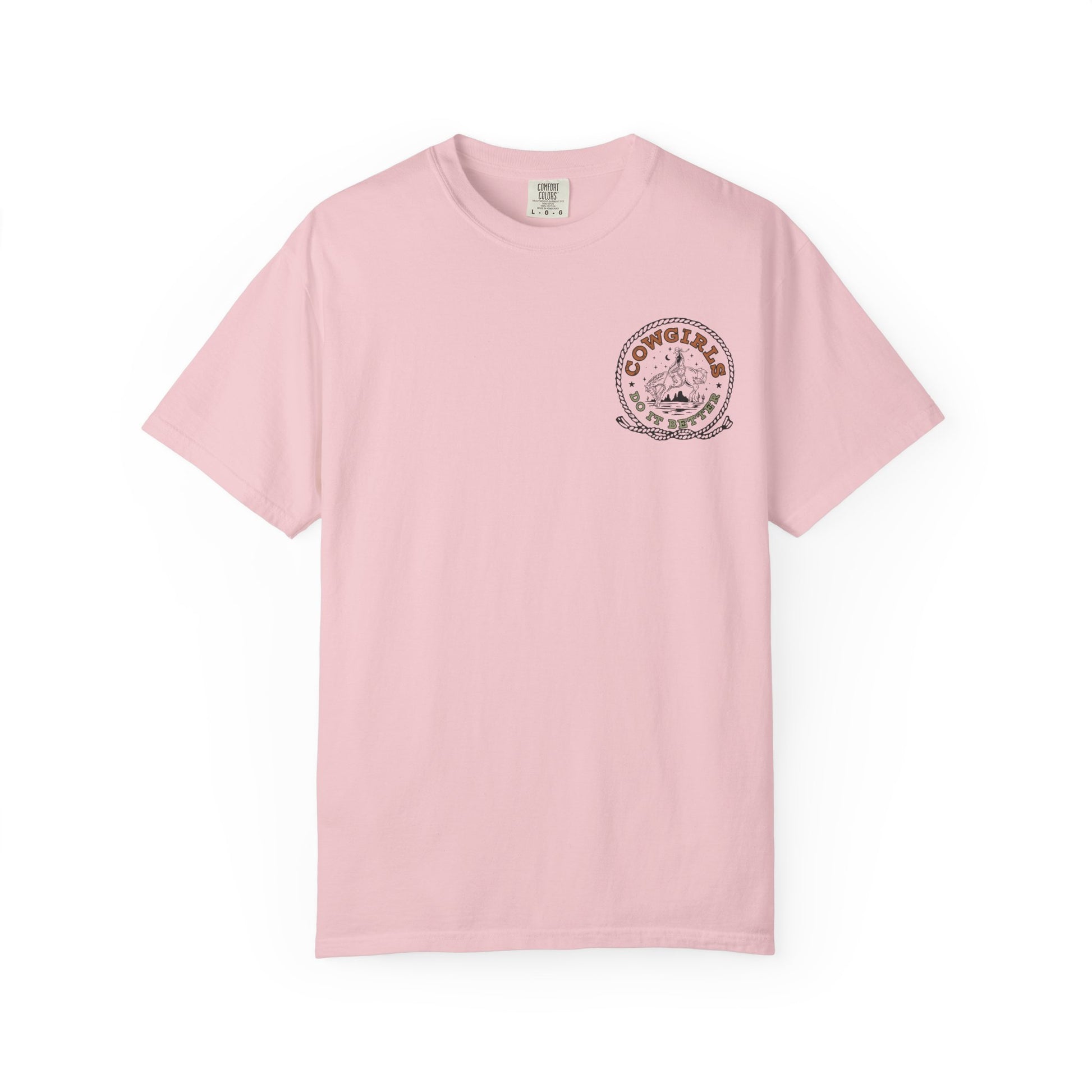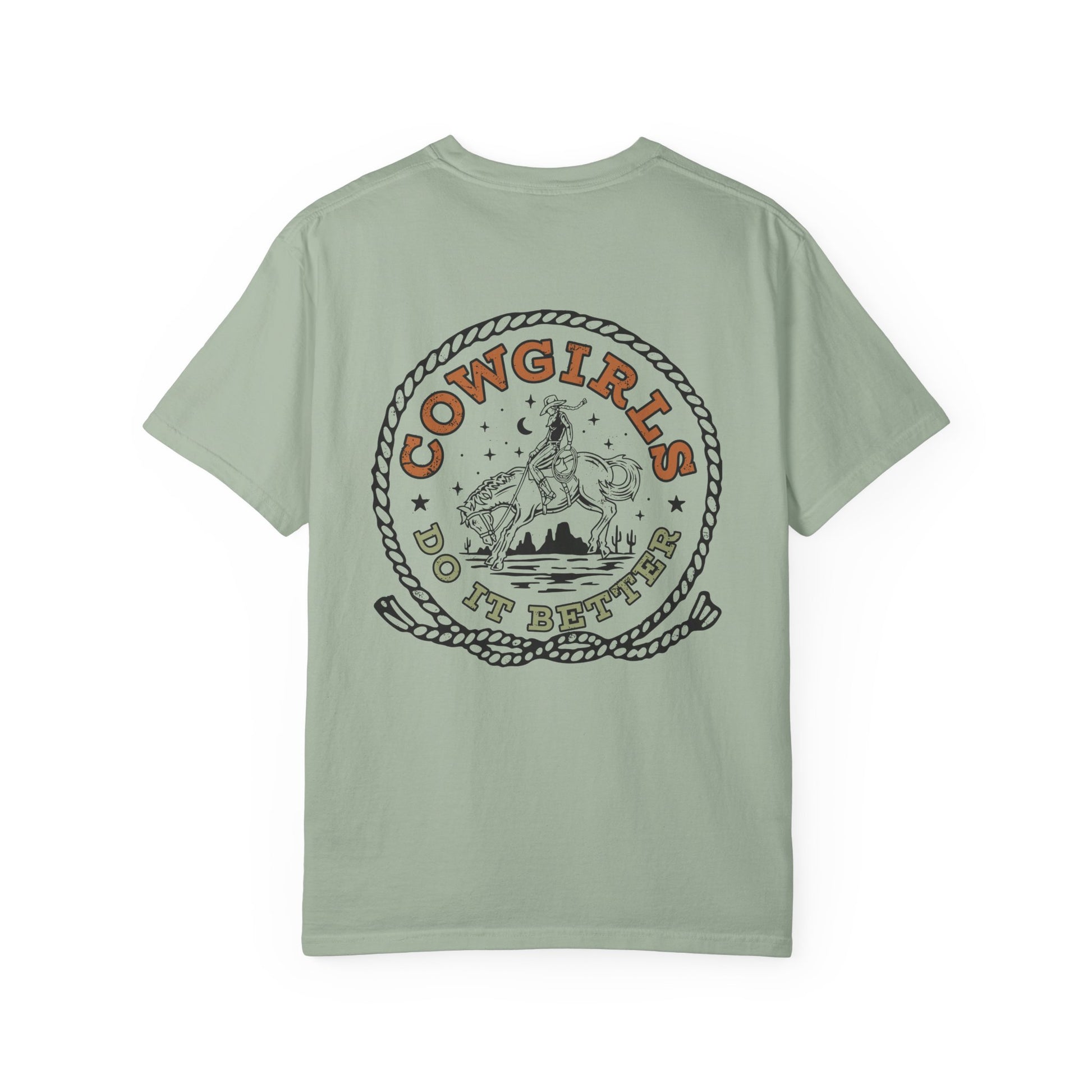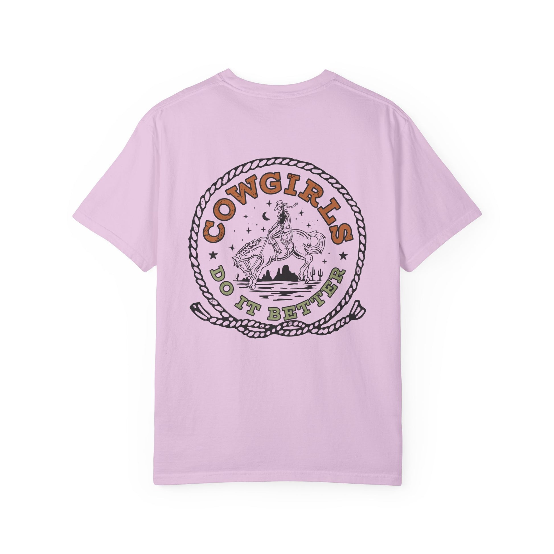 Soft, washed cotton with a lived-in feel and a bold, western heartbeat. This relaxed, garment-dyed tee lays easy over jeans or tucked into a high-waisted skirt, letting the vintage-style “Cowgirls Do It Better” artwork do the talking. The print’s rope frame, desert horizon and riding silhouette evoke late-afternoon trail rides and sun-warmed leather. Wear it to small rodeos, bonfires, or weekends when you want clothes that feel like an old friend — breathable, sturdy, and unmistakably western in attitude.