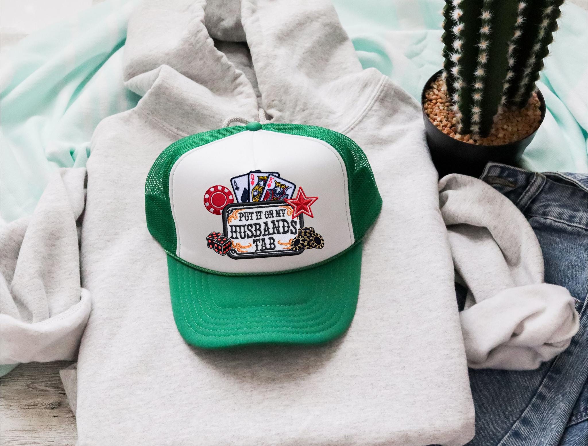 Put It On My Husbands Tab Trucker Hat, Western Trucker Hats, Gifts For Her, Funny Wife Hats, Best Friend Gifts, Bar Crawl Hats, Cute Hats