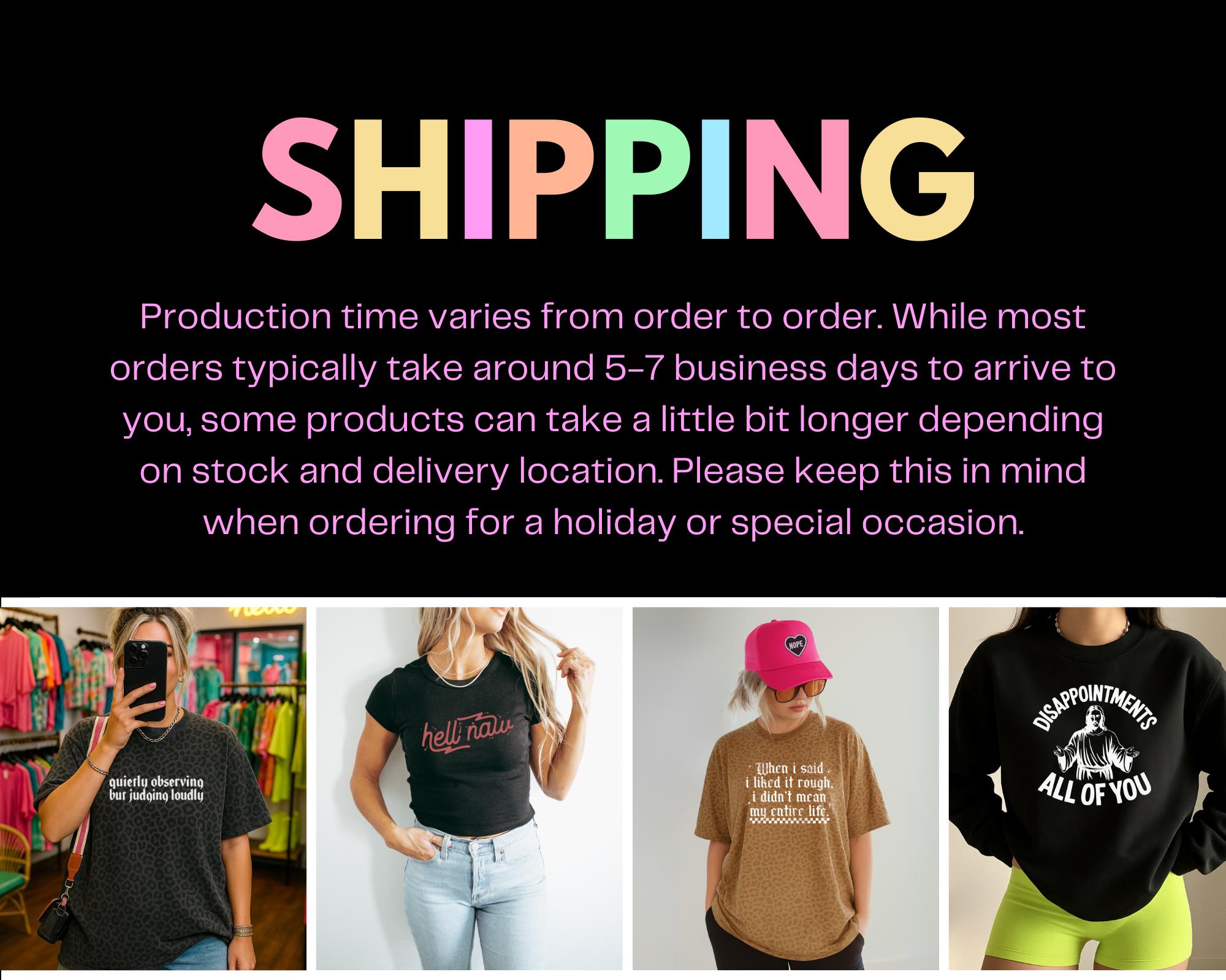 Because all Mayhem Threads items are custom made just for you, we’re not able to accept returns or exchanges based on size, color preference, or buyer’s remorse. Each piece is created specifically for your order, so we want to make sure you love what you pick before checkout.