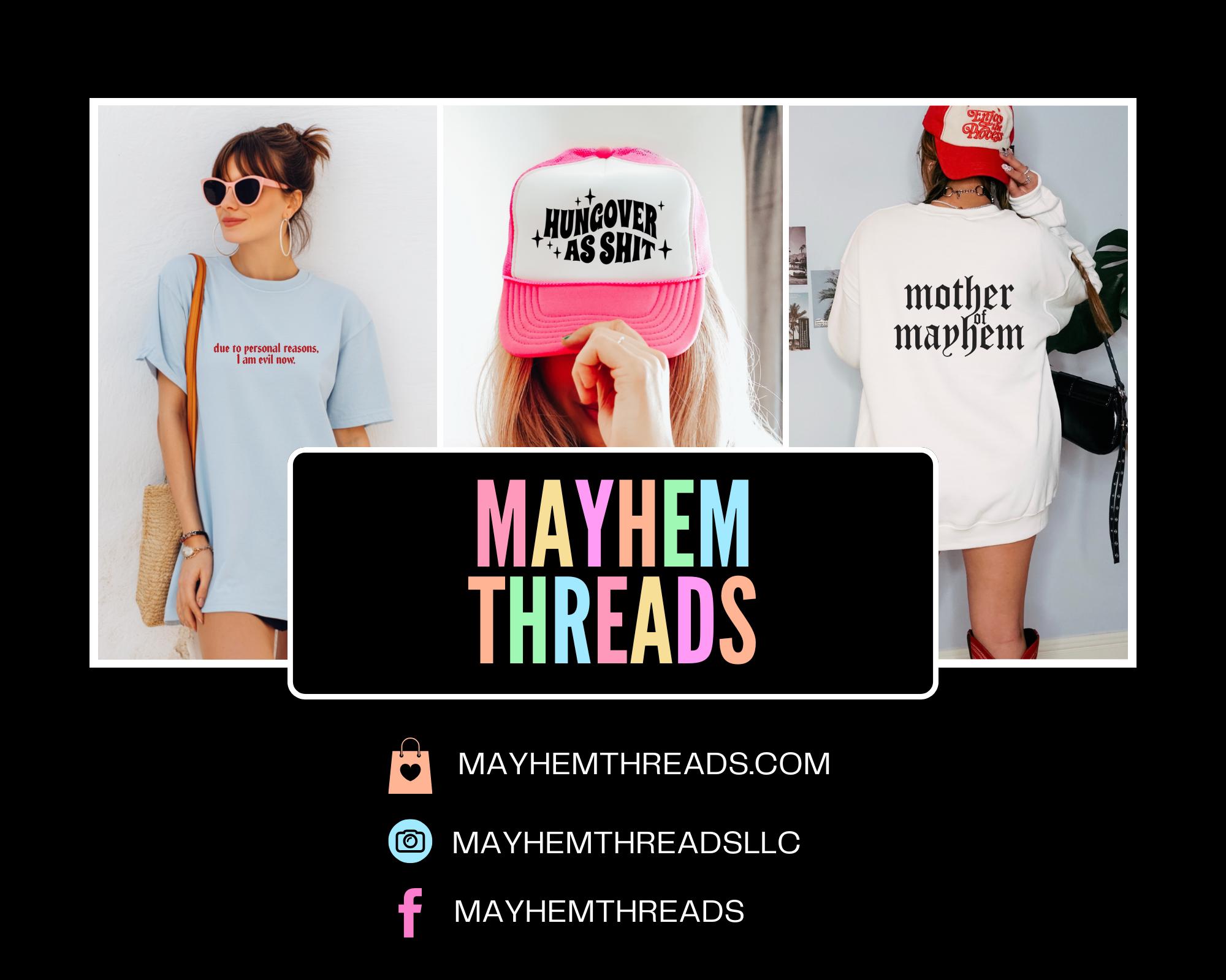 Because all Mayhem Threads items are custom made just for you, we’re not able to accept returns or exchanges based on size, color preference, or buyer’s remorse. Each piece is created specifically for your order, so we want to make sure you love what you pick before checkout.