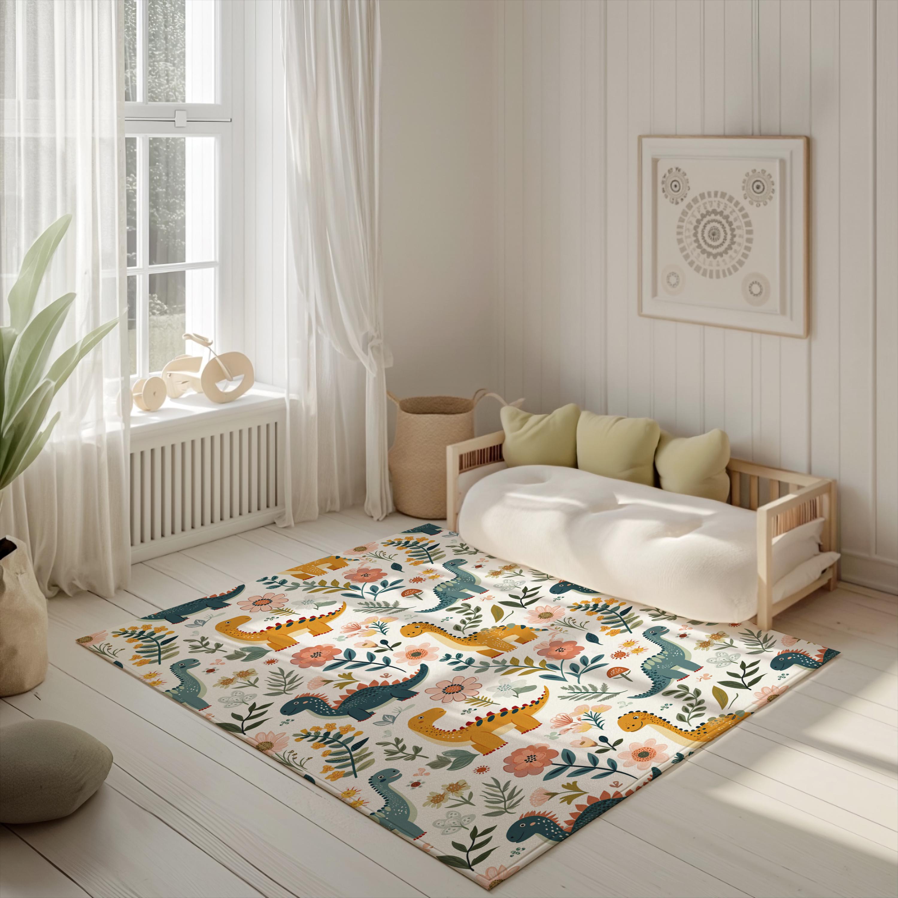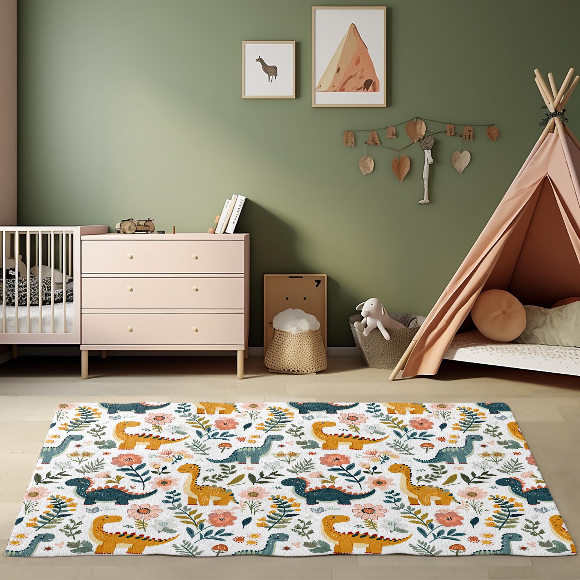dino nursery rug, kids playroom rug, dinosaur bedroom rug, toddler floor rug, dino baby decor, whimsical kids rug, floral dinosaur rug, nursery area rug, kids dino mat, baby room rug, toddler play rug, dinosaur kids decor, birthday gift rug, nursery decor rug, cute kids rug