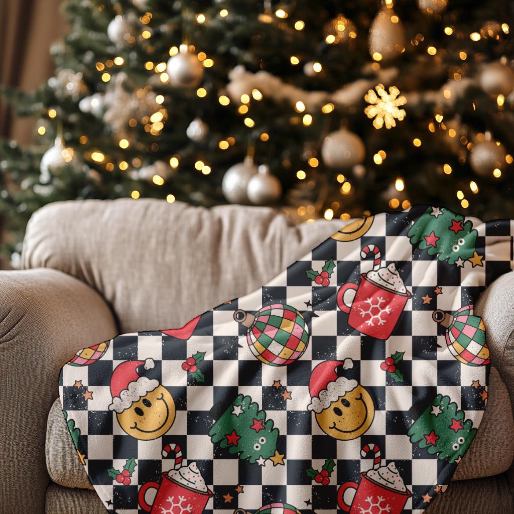 Cozy up with this festive Velveteen Plush Blanket that’s as joyful as a Christmas morning! Adorned with smiling Santa faces, cheerful trees, cocoa mugs, and ornaments on a checkered background, this blanket brings instant holiday happiness to any space. Perfect for snuggling on the couch, watching your favorite Christmas movies, or gifting to someone special who loves all things merry and bright.